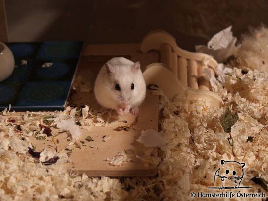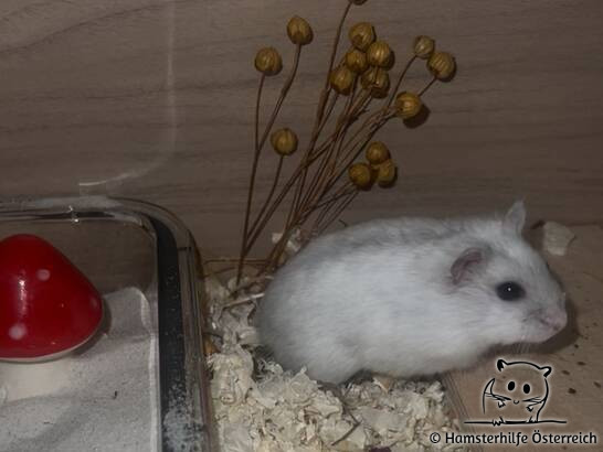 Die aufgeweckte Hamsterdame Aurora liebt es zu buddeln und taucht mitten in der Streu auf, wenn sie ein Leckerchen riecht. Beim Erlebnisfutter war sie zuerst sehr wählerisch, hat es nach der Zeit jedoch komplett abgeerntet. Für einen Mehlwurm tut sie jedoch alles und ist sonst auch sehr interessiert an Menschen. Momentan steht sie vormittags für ein paar Stunden auf, in denen sie sich die Zeit nimmt, das Gehege umzubuddeln. Nachts findet man sie im Laufrad, dass sie dann gar nicht mehr verlassen zu wollen, scheint, da sie sich für ein kurzes Nickerchen auch einfach auf der Lauffläche hinlegt.