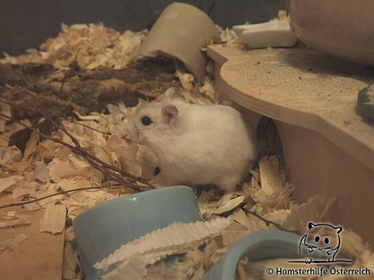 Enid kam sehr dünn, ängstlich und verschreckt bei uns an, und wurde dann erstmal eine ganze Weile nicht mehr gesehen. Bis sie den heiligen Hamster-Gral entdeckt hat: Gurkenkernchen. Die nimmt die Süße mittlerweile ohne Angst aus der Hand. Auch wenn jemand an ihrem Gehege vorbeigeht oder der Deckel aufgeht reagiert sie mittlerweile mehr neugierig als ängstlich.