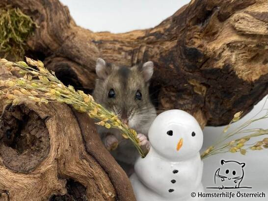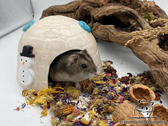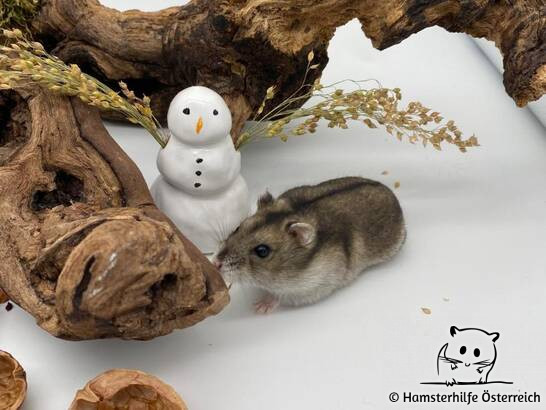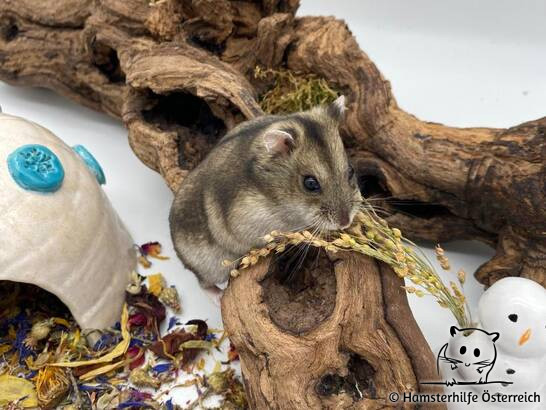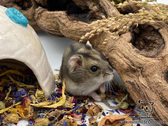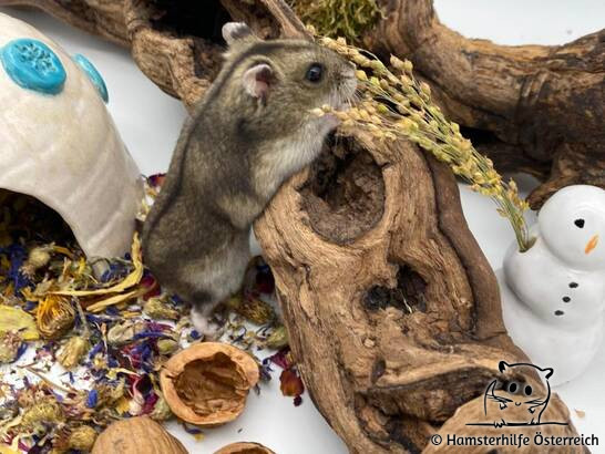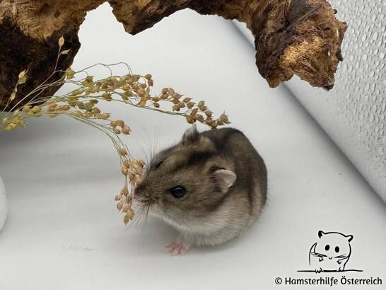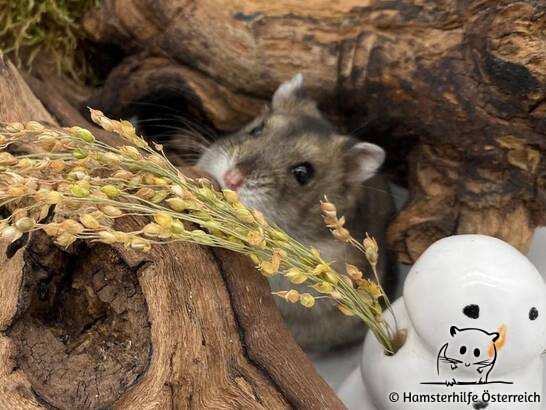 Hannelore ist noch etwas schüchtern und beobachtet lieber erst mal vorsichtig, bevor sie sich traut näher zu kommen. Jedoch ist sie sehr neugierig und man merkt, dass sie langsam Vertrauen fasst. Kernchen nimmt sie zwar noch nicht aus der Hand, doch sie bleibt ruhig, solange man keine plötzlichen Bewegungen macht. Hannelore genießt ausgiebige Sandbäder, weswegen sie ein wunderschönes volles und flauschiges Agoutifell hat, das sehr gepflegt ausschaut. Auch liebt sie es, neue Verstecke auszuprobieren. Das Laufrad wird von ihr auch sehr gerne mit viel Ausdauer benützt. Man spürt, dass in ihr eine sanfte Seele steckt und mit etwas Geduld und Ruhe bestimmt bald eine zutrauliche kleine Hamsterdame aus ihr wird.