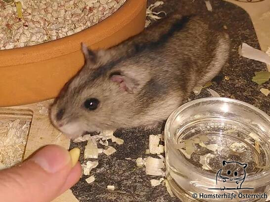 Jakara war anfangs etwas zurückhaltend und teilweise schreckhaft. Inzwischen ist sie aber voll angekommen und hat sich zu einem unerschrockenen Hamstermädchen entwickelt. Sie ist immer wieder untertags unterwegs, lässt sich super beobachten und nimmt problemlos Leckerchen aus der Hand.