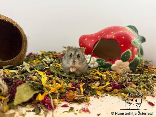 Kiara ist eine eher ruhige Hamsterdame, die man aber super beobachten kann. Sie liebt es, im Badesand zu buddeln und gestaltet gerne das Gehege um. Also man sollte sich auf Umbauarbeiten einstellen 🙂