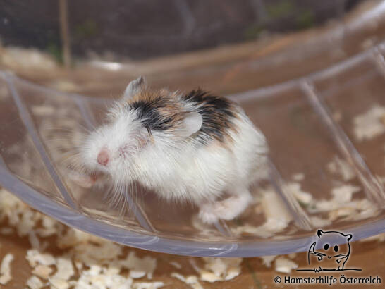 Pixi ist ein zartes Robo-Mädchen, das beim Einzug gerade einmal 12–13 g wog. Sie wurde mit etwa 10 Wochen gemeinsam mit ihren Geschwistern abgegeben, die bis dahin leider noch zusammen in einem Käfig lebten – hoffentlich bleibt ihre Schwangerschaftsquarantäne ereignislos. Pixi hatte offenbar starke Augenentzündungen und ist vermutlich vollständig blind: Ein Auge ist komplett resorbiert, das andere trüb und noch entzündet. Davon lässt sich die Kleine jedoch kaum beeindrucken. Pixi ist wahnsinnig aktiv, lebensfroh und für einen Robo sogar schon mutig – sie momentan sehr viel wach – Vormittags und dann wieder spätabends. Die Aufstehzeiten können sich vorallem nach einem Umzug immer ändern. Sie flitzt sicher durch ihr Gehege und kommt mit ihrer Blindheit erstaunlich gut zurecht. Wichtig sind für sie lediglich geringe Fallhöhen (ca. 5cm), keine spitzen oder gefährlichen Gegenstände im Weg und eine übersichtliche, gut strukturierte Einrichtung, an der sie sich orientieren kann. Pixi ist eine tapfere kleine Kämpferin mit ganz viel Lebenswillen.